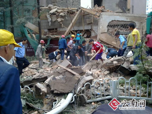 今天(6月23日)上午11时15分左右,云南饭店在拆迁过程中突然发生倒塌。靠东风西路一边正在被拆迁的一堵高大约7米的墙体砸向公交站台,一辆5路公交车正在站台上下客,由于墙体离公交站台非常近,正在下车的两名乘客(一男一女)被砸伤。随后,救护车迅速赶往现场,目前,两名伤者均已被送往医院抢救,伤势尚不清楚。
