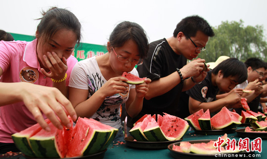 青年男女在吃西瓜大赛上大快朵颐。中新社发 苏丹 摄