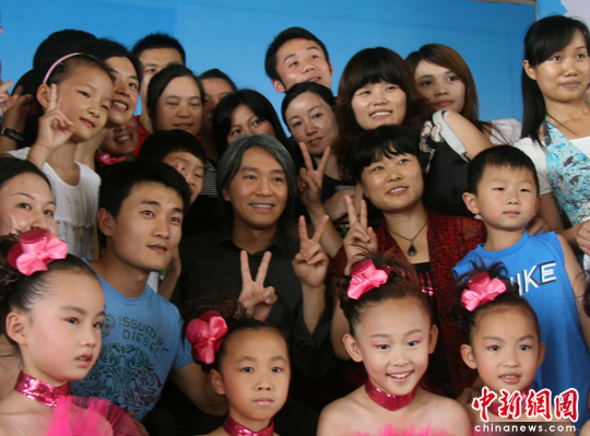 周星驰与长沙中小学生和老师合影。邓霞 摄