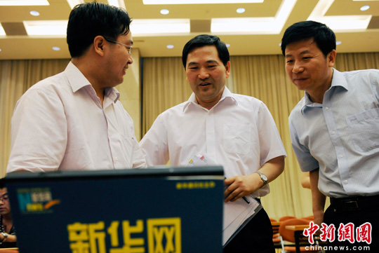 中组部新闻发言人邓声明(图中)首次亮相媒体。中新社记者 刘震 摄