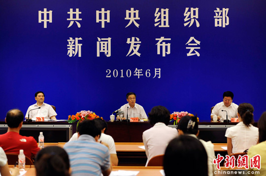 中组部新闻发言人邓声明(图左)首次亮相媒体。中新社记者 刘震 摄
