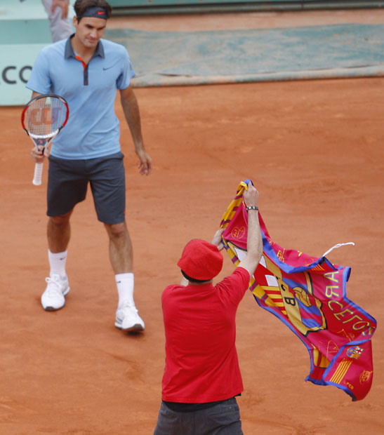 法网男单决赛场上,一位费天王的痴心球迷冲入球场,强行将自制的一顶帽子戴到费德勒的头上。安保人员及时出现,将狂热粉丝架出场外。