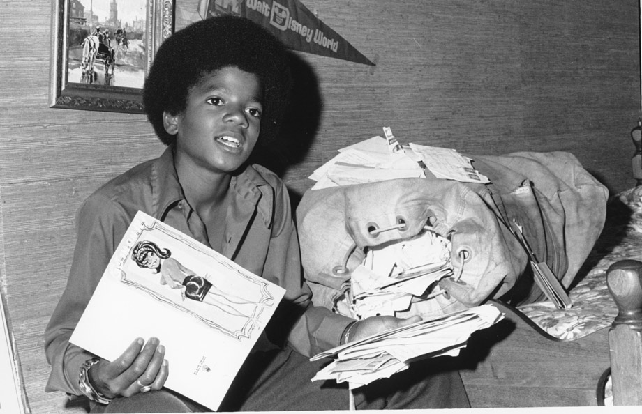1972年,迈克尔·杰克逊在圣费尔南多谷的家中展示歌迷寄来的明信片。
