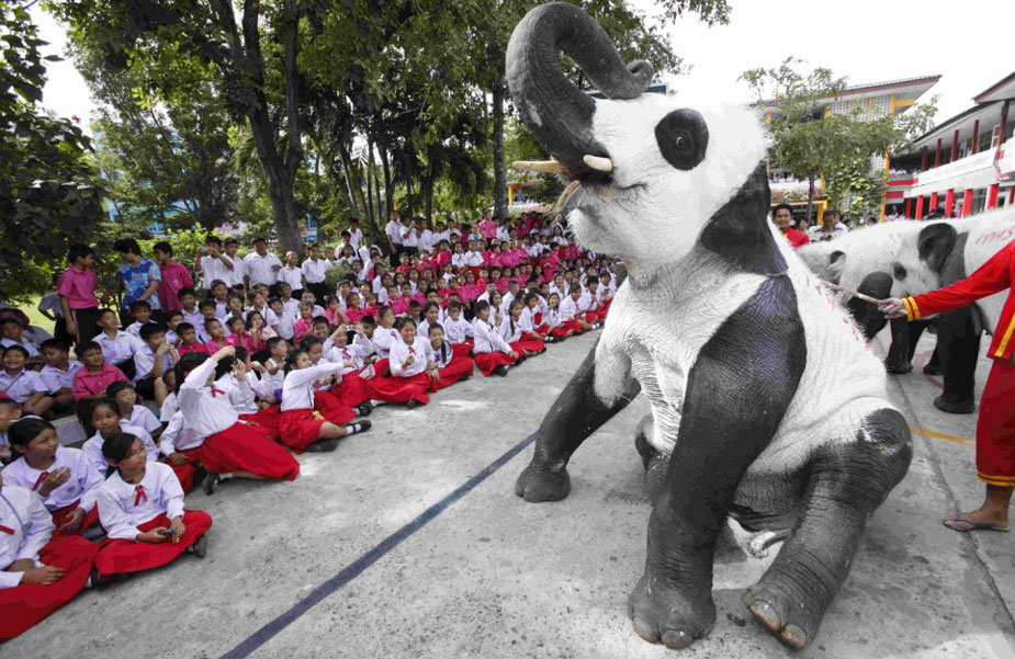 被绘成熊猫模样的大象在给学生们表演。