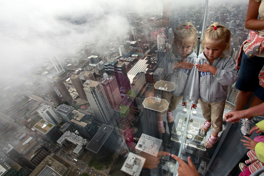 7月1日,美国芝加哥,西尔斯大厦在第103层瞭望台增设的玻璃阳台对媒体开放。这些玻璃阳台建在大厦西侧,从瞭望台向外延伸约1.2米。阳台的玻璃地板厚达12.7厘米,可承重约5吨。