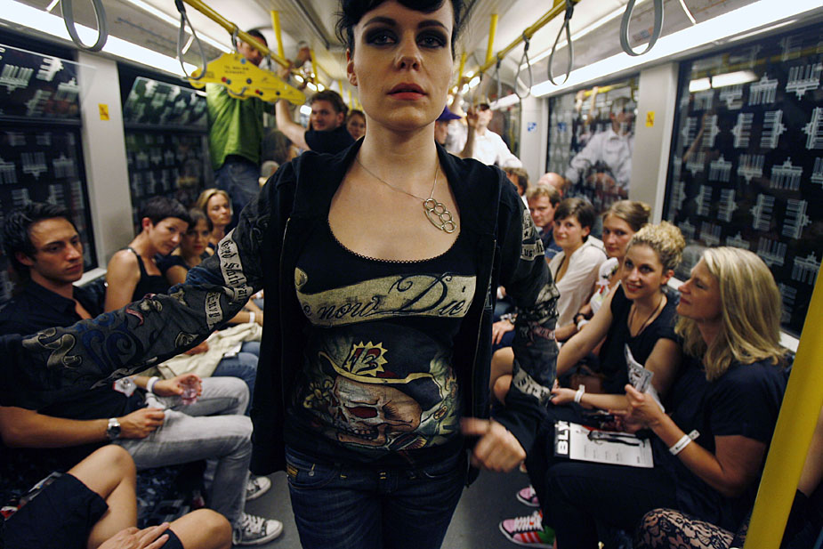 7月2日,模特在德国首都柏林的一辆地铁上,演绎名为“地铁上的猫步”时装秀。
