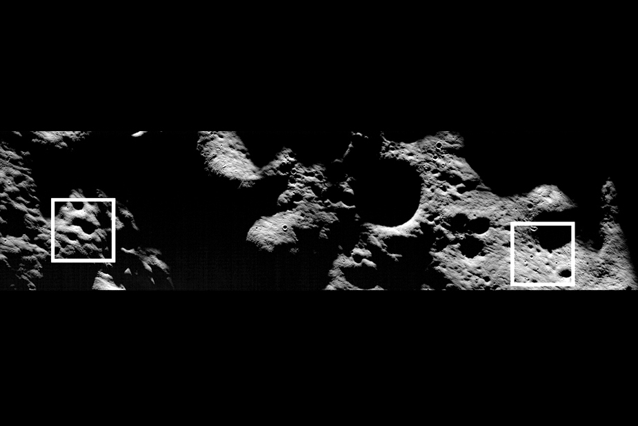 此图显示的是月球表面两个位置的相互关系,图片显示的地区宽3542米,长14000米。