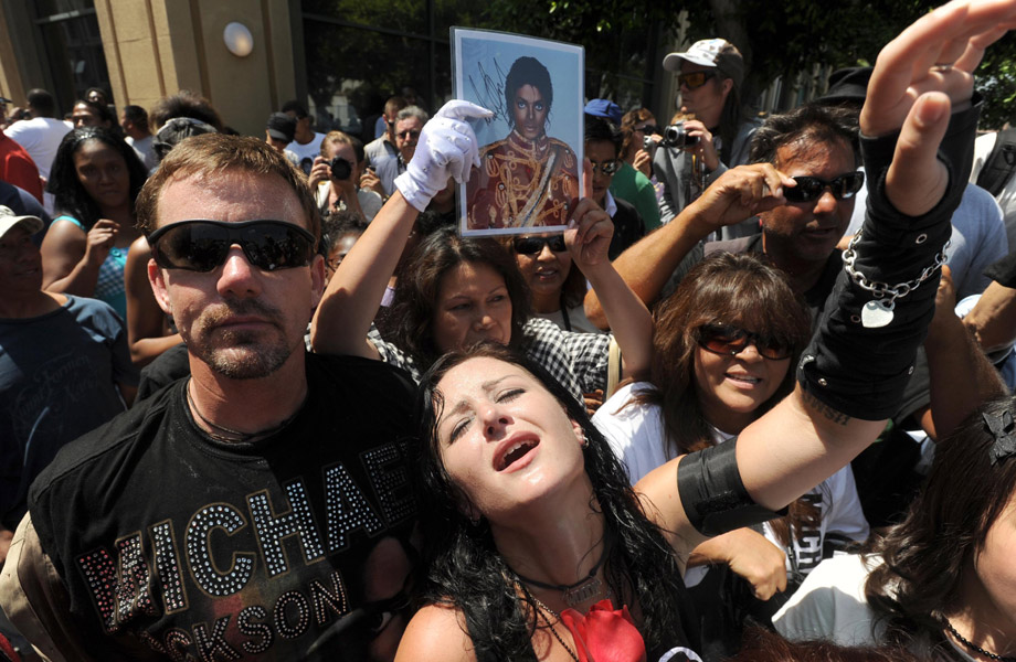 数百名没有入场券的歌迷聚集在附近的警戒线外高呼迈克尔的名字,共同悼念一代“流行天王”。 中新社发 张炜 摄