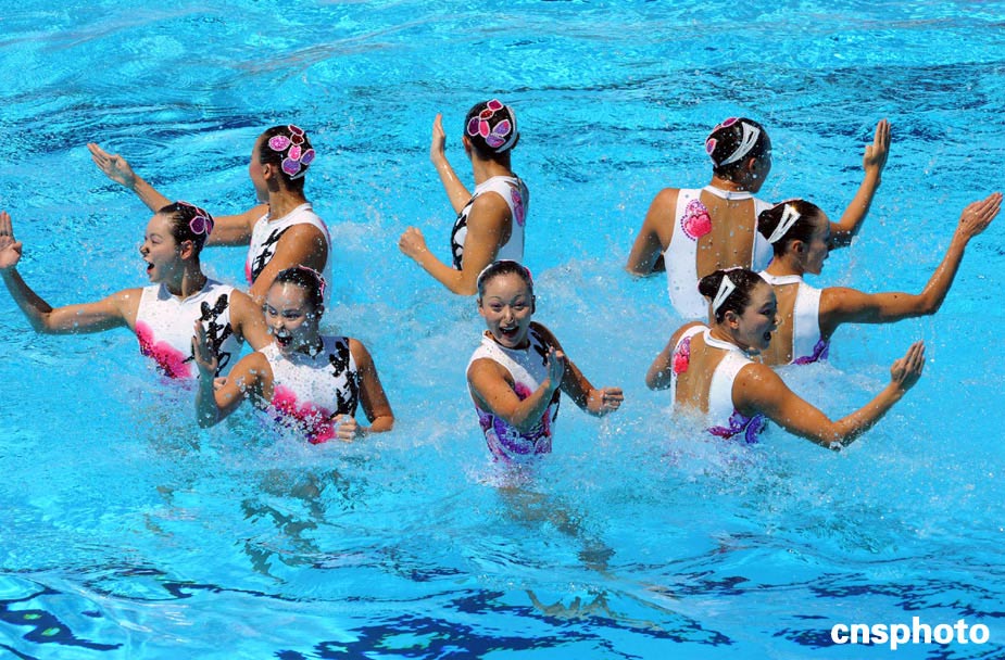 7月19日,中国队的姑娘们以中国功夫亮相罗马游泳世锦赛花样游泳集体技术自选动作决赛泳池。当日,第13届游泳世锦赛花样游泳项目在意大利罗马举行,集体技术自选动作的决赛中,俄罗斯队毫无悬念地夺得冠军,西班牙队获得亚军,中国队获得了这个项目的季军,创造了自己在世锦赛上的最好成绩。中新社发 廖攀 摄