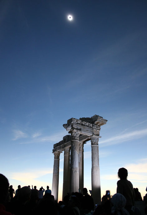 图为2006年3月29日,在土耳其阿波罗神庙前人们正在观测日全食景观。