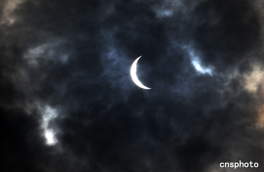 7月22日上午,由于连云港天空云层较厚,给观察拍摄日全食带来困难。但通过耐心等待,日全食演变的部分过程还能透过云层时断时续地看到。因受地理位置等因素的影响,连云港市只能看到90%的日偏食。