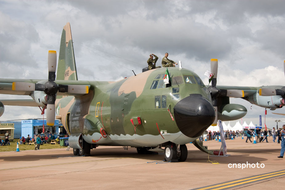 2009年7月,“2009英国费尔福德航展”在英格兰费尔福德开展。图为在英国费尔福德航展作静态展示的阿尔及利亚空军C-130H运输机。中新社发 潘禹 摄