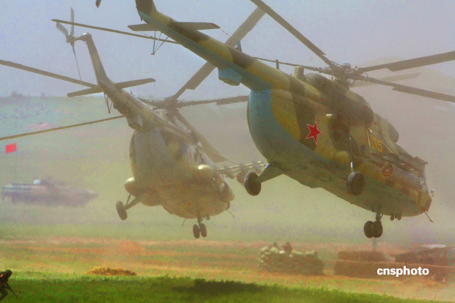 中国、俄罗斯两军总参谋长,7月23日上午到沈阳军区洮南合同战术训练基地,观看“和平使命2009”联合反恐军事演习。双方以陆军和空军为主,中方参演部队包括1个陆军战斗群和1个空军战斗群。俄方参演兵力包括1个陆军加强摩步营、1个空降突击连和部分空军兵力,双方投入兵力两千多人。中新社发 宋吉河 摄