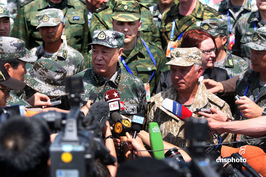 中国、俄罗斯两军总参谋长,7月23日上午到沈阳军区洮南合同战术训练基地,观看“和平使命2009”联合反恐军事演习。双方以陆军和空军为主,中方参演部队包括1个陆军战斗群和1个空军战斗群。俄方参演兵力包括1个陆军加强摩步营、1个空降突击连和部分空军兵力,双方投入兵力两千多人。中新社发 宋吉河 摄