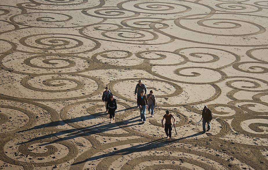 据英国媒体7月27日报道,艺术家Andres Amador用耙子在沙滩上作画,众多中心对称的几何图形,不在乎是否能长久保留,但求被海浪带走前与大自然的完美融合。