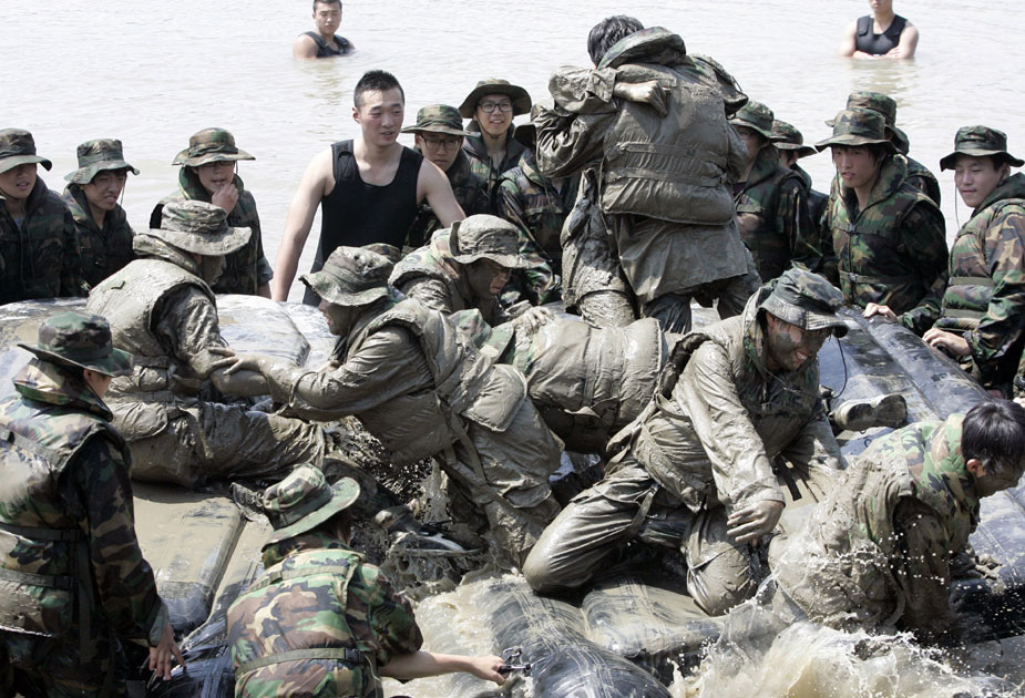 当地时间7月30日,在首尔的美军基地参加军训夏令营的韩国数百名学生来到金浦进行了泥地训练,场面十分激烈甚至残酷。