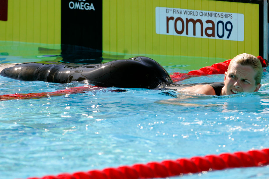 “有脚的美人鱼”——7月30日,布丽塔·斯特芬在女子100米自由泳预赛后横跨泳道线秀美臀。