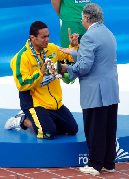 “能再给我一块吗?”——7月29日,巴西选手席尔瓦获得男子50米蛙泳银牌后长跪在领奖台上。