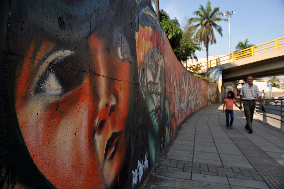 近日,哥伦比亚考卡山谷省卡利市的年轻人用涂料在墙上涂鸦,表达他们对世界的看法。
