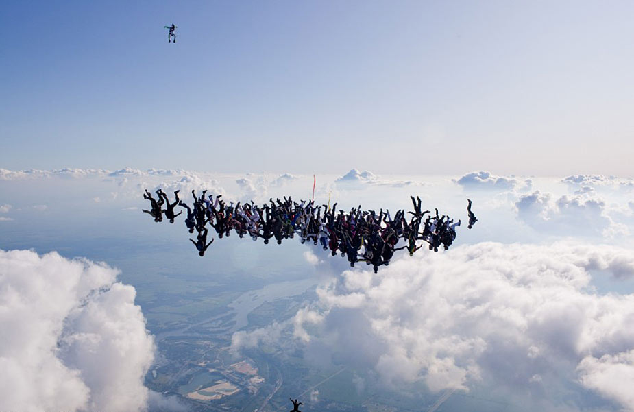 据英国媒体8月2日报道,美国上空108名伞降者从1.8万英尺(约5.48公里)高空以180英里每小时时速跳下,并在空中组成各种图形,欲打破世界纪录。