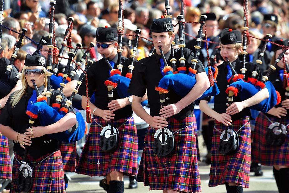 8月2日,苏格兰梅西尔风笛乐队的艺术家们在洛里昂克尔特文化节上进行表演。