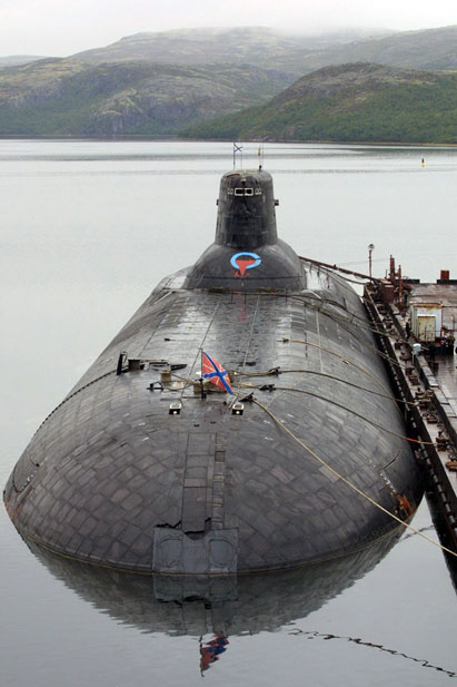 这种水下武器平台的技术数据是令人震惊的。它拥有钛金属制造的外壳,全长173米,宽24.6米,高42.7米,相当于一座10层大楼,水面航行时吃水深13米,水下排水量可以达到2.65万吨,水面航速达到每小时30公里,潜航速度可以达到每小时50公里,最大下潜深度500米,持续潜航时间达到120天。在冷战期间,六艘“台风”级潜艇就位于距离挪威边境50公里的Zapadnaya Litsa海军基地。