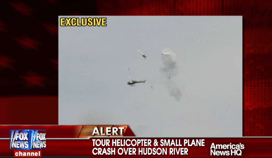 8月8日,纽约市曼哈顿西侧的哈德逊河上空,一架观光直升飞机和一架小型飞机相撞,两飞机双双坠入河中。据称观光直升飞机上载有五名意大利游客和一名飞行员,而小型飞机上则有三人。图为电视台播放的两飞机相撞的视频截图。