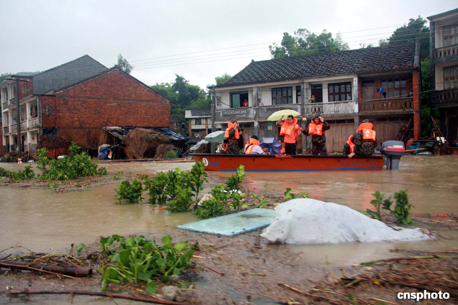 八月九日,武警官兵进入福鼎南墘村抢救受灾民众。受台风“莫拉克”强降雨的影响,福建宁德福鼎南墘村大面积受淹,大水同时也将通往该村的道路全部淹没,致使该村犹如“孤岛”,该村近三百名村民被困。中新社发 王东明 摄