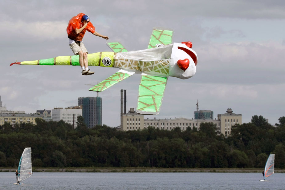 8月9日,莫斯科河畔举办一年一度的“坠落节”,表演者带着自己设计制作的各种“飞行器”勇敢的从高空跳入水中。