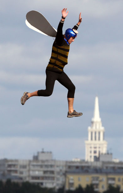 8月9日,莫斯科河畔举办一年一度的“坠落节”,表演者带着自己设计制作的各种“飞行器”勇敢的从高空跳入水中。