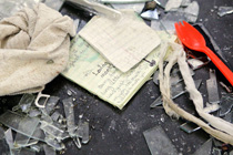 图为一名囚犯的信和地板上到处都是的碎玻璃。8月8日晚至9日凌晨,美国加州南部奇诺市发生大规模监狱骚乱,截至目前,在250多名受伤的在押犯人中,仍有16名犯人在医院接受治疗。