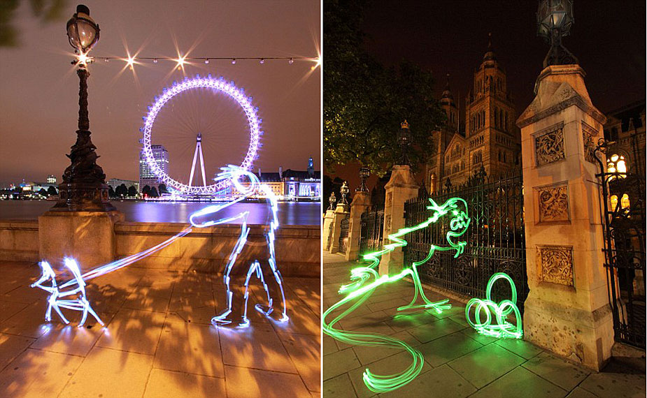 摄影师Michael Bosanko在英国伦敦拍摄的名为“溜狗的人”(左)和“恐龙”的光涂鸦照片。