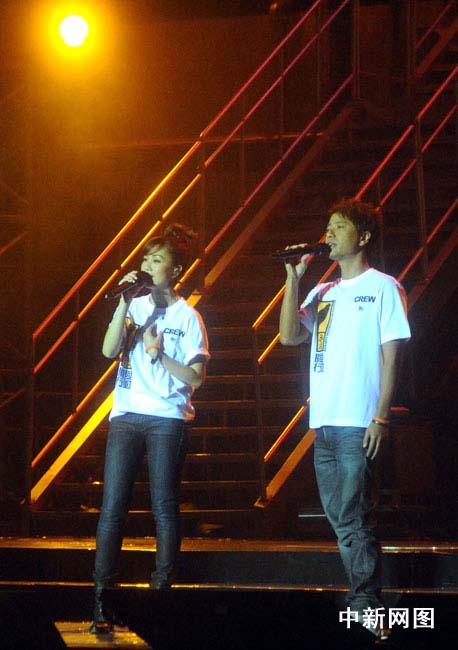 图为李克勤与谢安琪现场演出。
