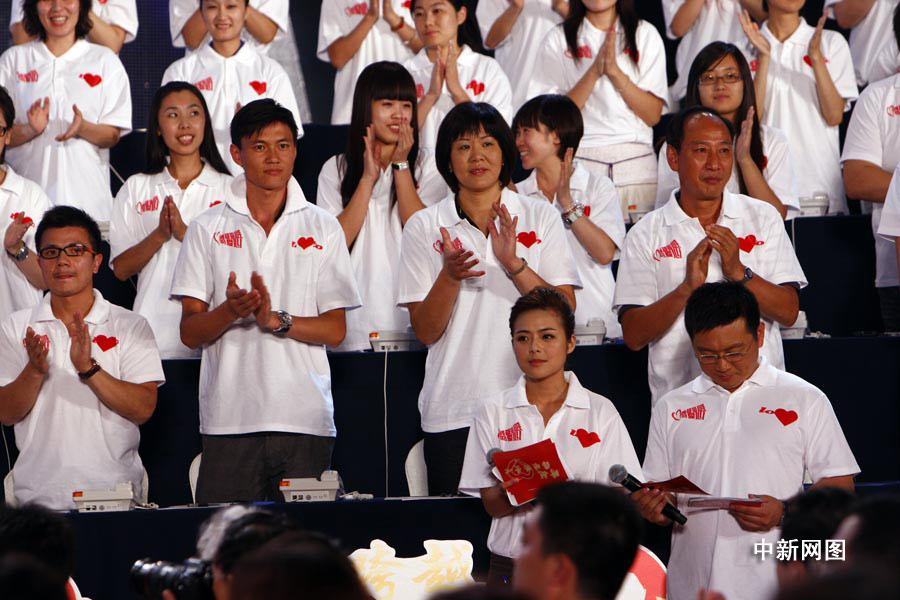 “跨越海峡的爱心”——大陆同胞援助台湾“莫拉克”台风受灾同胞赈灾晚会在北京举行。众多文体界明星在现场亮相。图为郎平、孙海平、仲满等亮相赈灾晚会。中新社发 杜洋 摄