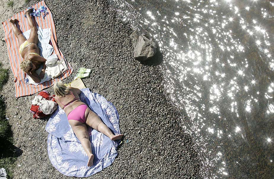 游人们在乌克兰基辅的沙滩上晒日光浴。