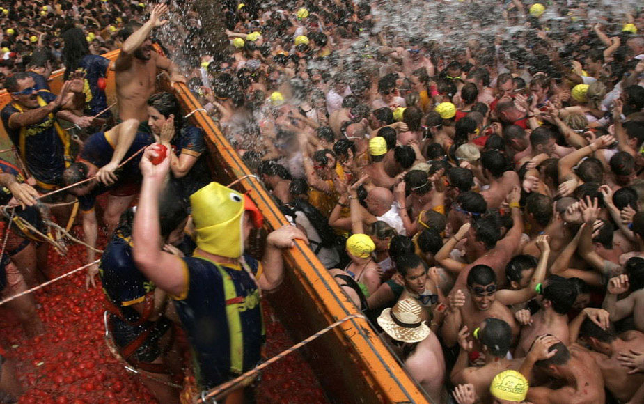 8月26日,西班牙东南部小镇Bunol当日迎来传统的西红柿节。大约4万名狂欢者在1小时内扔掉了11万公斤西红柿。来源:中国新闻网