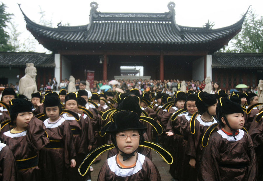 2009年8月31日,南京夫子庙小学一年级新生在南京夫子庙参加了“开笔破蒙”仪式。点朱砂、写“人”字、念《论语》……接受传统文化熏陶成为孩子们新学期的第一课。一年级新生穿着统一的“祭孔服”,老师们挨个在孩子们额头点上朱砂痣,并送上祝福的话。点朱砂,又称“开天眼”,寓意孩子从此眼明心明,好读书,读好书。麦兜/CFP