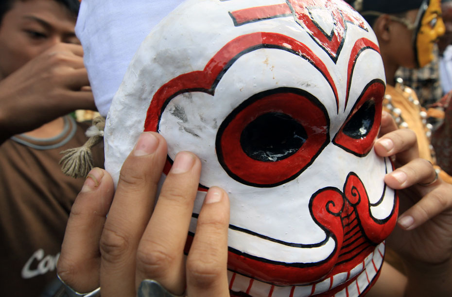 图为节日当天人们戴上传统的尼泊尔面具载歌载舞。