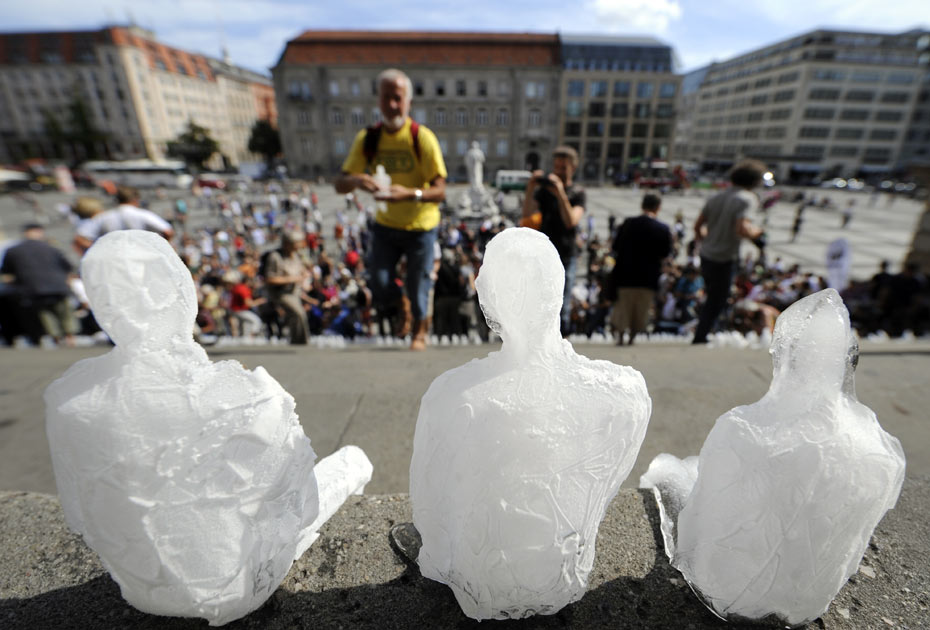 9月2日,德国柏林,世界野生动物基金会(WWF)将1000个小冰人被放置在了御林广场音乐厅的台阶上,小冰人慢慢融化成水。活动的组织者希望此举能引起公众对于全球变暖的关注。来源:中国新闻网