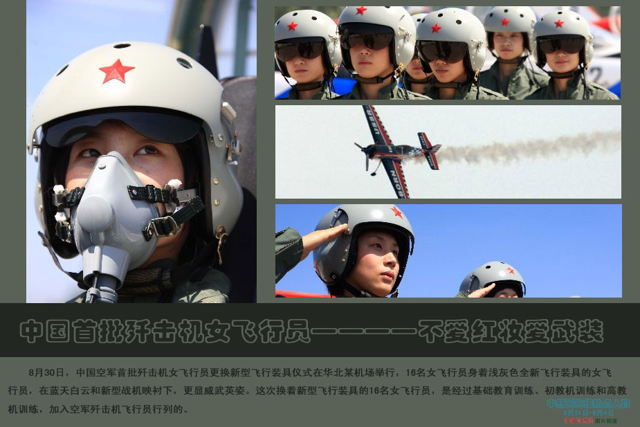 中新网本周热点人物之——中国首批歼击机女飞行员 8月30日,中国空军首批歼击机女飞行员更换新型飞行装具仪式在华北某机场举行,16名女飞行员身着浅灰色全新飞行装具的女飞行员,在蓝天白云和新型战机映衬下,更显威武英姿。这次换着新型飞行装具的16名女飞行员,是经过基础教育训练、初教机训练和高教机训练,加入空军歼击机飞行员行列的。来源:中国新闻网