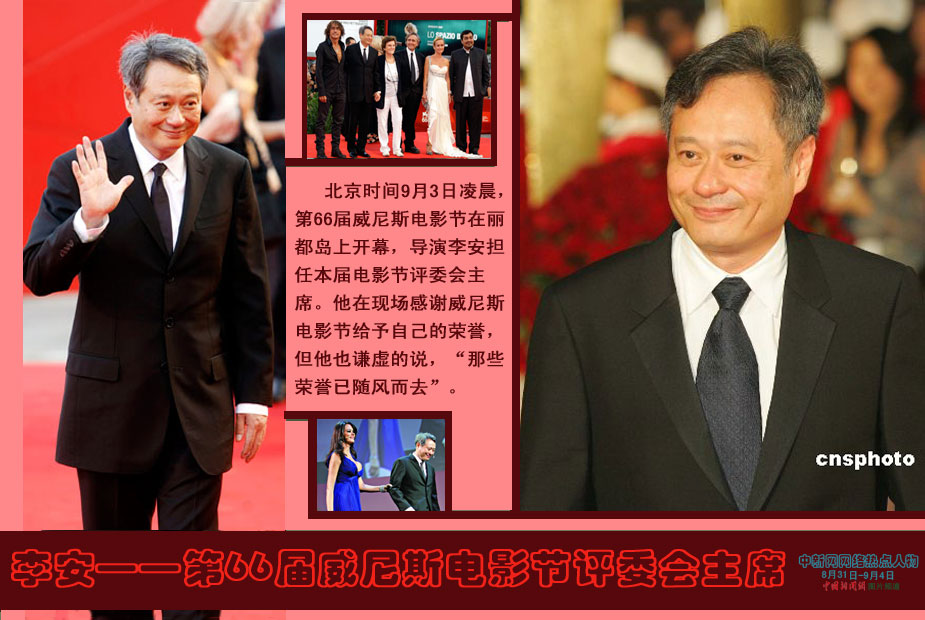 中新网本周热点人物之——李安 北京时间9月3日凌晨,第66届威尼斯电影节在丽都岛上开幕,导演李安担任本届电影节评委会主席。他在现场感谢威尼斯电影节给予自己的荣誉,但他也谦虚的说,“那些荣誉已随风而去”。来源:中国新闻网、新京报