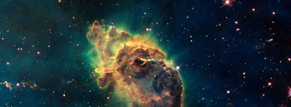 图为哈勃望远镜上的相机拍摄的船底座星云中的由炙热的气体和尘埃组成的“创造之柱”。船底座星云位于距离地球7500光年的船底星座,是孕育恒星的地方。