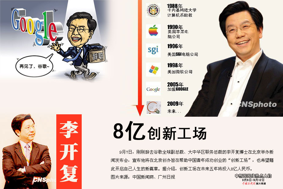 中新网本周热点人物之——李开复 刚刚辞去谷歌全球副总裁、大中华区职务总裁的李开复博士在北京举办新闻发布会,宣布他将在北京创办旨在帮助中国青年成功创业的“创新工场”,也希望藉此开启自己人生的新篇章。据介绍,创新工场在未来五年将投入8亿人民币。
