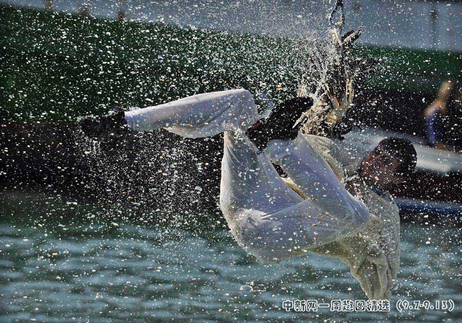 9月6日,西班牙巴斯克地区举行传统“鹅日”活动。人们用绳子将一些死鹅吊在空中,狂欢者跳起猛扯鹅头,看谁能取下。图片来源:中国新闻网
