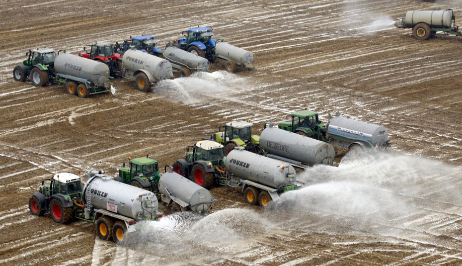 16日,比利时奶农向地里倾倒了3百万升鲜牛奶做“农肥”,抗议奶价暴跌。