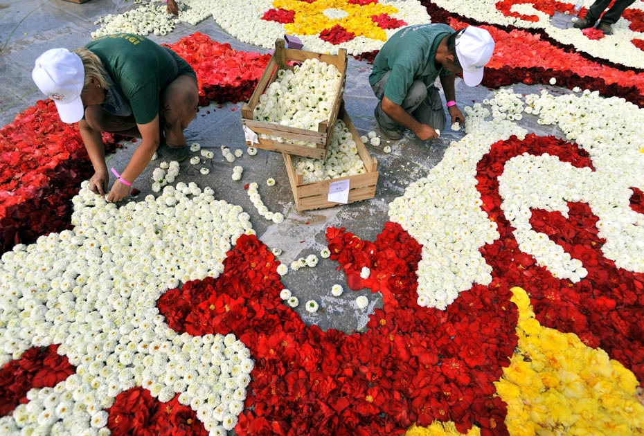 据悉,原本计划全部使用以色列的鲜花,但由于当地的鲜花产量不足,只能从布鲁塞尔进口,这批鲜花每朵花的直径都在20厘米左右。百名志愿者们费时7小时精心铺成了这张花毯,这张鲜花地毯将展示三天,随后将被生态埋葬。