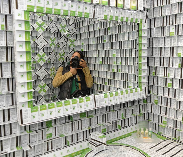 9月17日,在美国纽约,一位名叫布赖恩的设计师展示他利用房门卡设计的客房。这个占地约37平方米的酒店接待大厅、卧室和卫生间是利用20多万张房门卡搭建而成的。