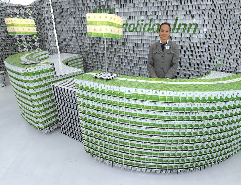 9月17日,在美国纽约,一位名叫布赖恩的设计师展示他利用房门卡设计的客房。这个占地约37平方米的酒店接待大厅、卧室和卫生间是利用20多万张房门卡搭建而成的。