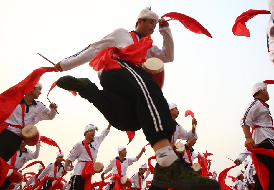 9月16日,千余名来自陕西安塞的腰鼓队员在北京密云训练基地首次和其他方阵合练。该方阵队员全部是来自陕西省延安市安塞县的农民,10月1日他们将走在群众游行队伍中,在天安门城楼前舞起安塞腰鼓。该方阵也是群众游行队伍中唯一一支京外队伍,唯一一个全部由农民组成的方阵。杜洋 摄 图片来源:中国新闻网