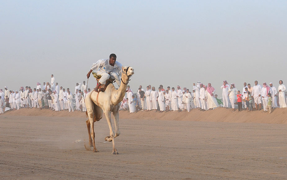 9月25日,在沙特阿拉伯东部的哈利斯,骆驼骑士们骑着自己的座驾在大漠中飞驰。图片来源:中国新闻网